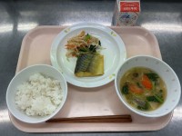 今日の給食は、麦ごはん、牛乳、魚のカレー焼き、きのこ入りおひたし、田舎汁です。