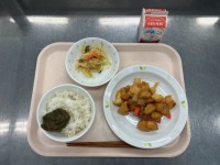 今日の給食は、ごはん、牛乳、魚の立田揚げ、野菜のごま風味、みそ汁です。今日はオー...