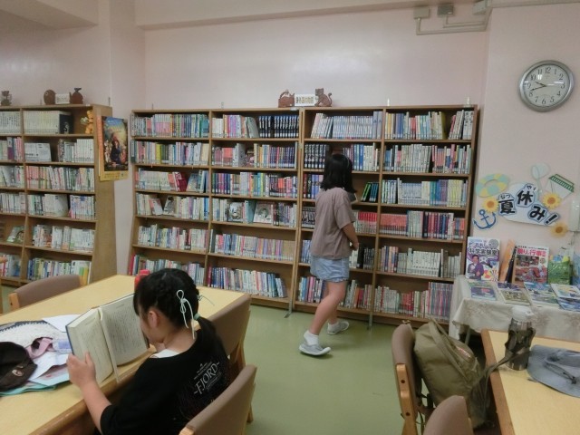夏休みまでに借りた本を返して借りたり、図書室の本を読むことができます。