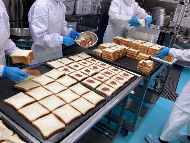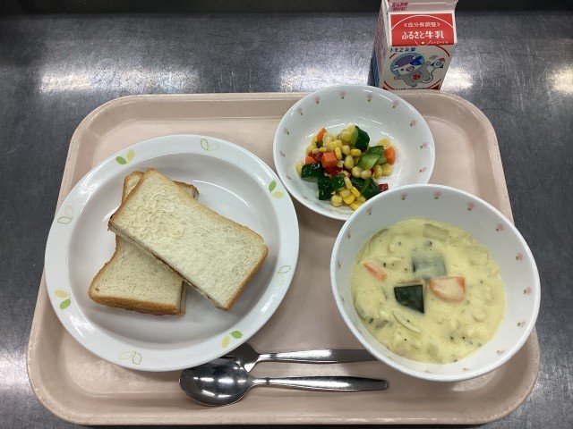 今日の給食は、いちごジャムサンド、牛乳、パンプキンシチュー、トロピカルサラダです。