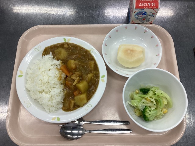 今日の給食は、ひよこ豆入りカレーライス、牛乳、ブロッコリーのサラダ、くだもの(なし)です。
