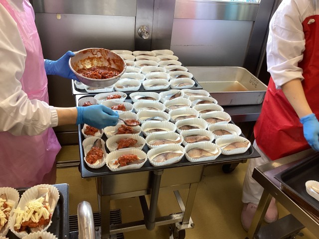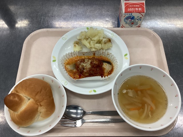 今日の給食は、ミルクパン、牛乳、魚のピザ風、ジャーマンポテト、コンソメスープです。