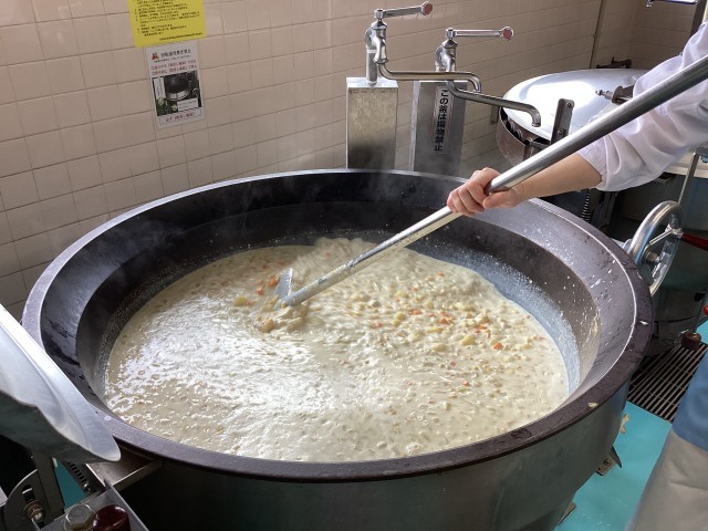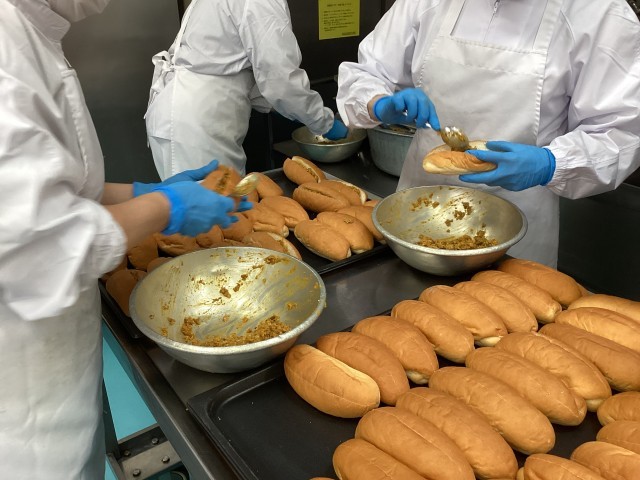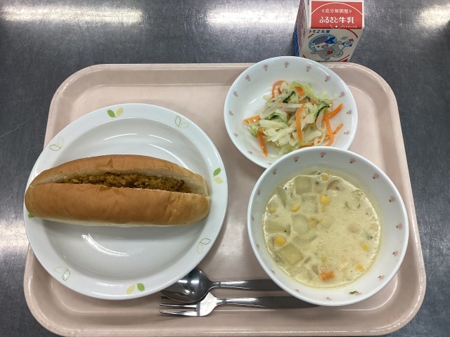 今日の給食は、ドライカレーサンド、牛乳、クリームスープ、たまネギドレッシングのサラダです。