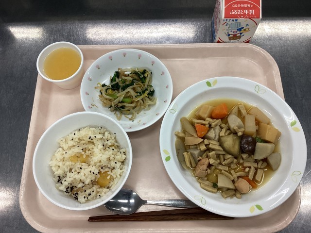 今日の給食は、栗ごはん、牛乳、鶏肉と里芋のうま煮、菊の花入りおひたし、フルーツゼリーです。