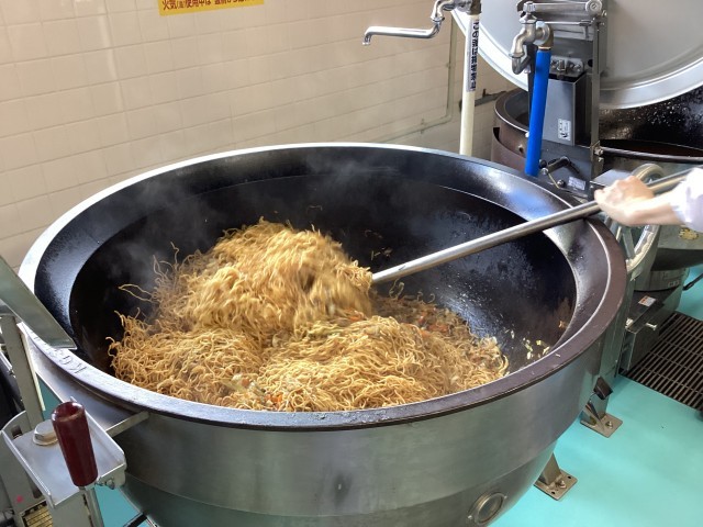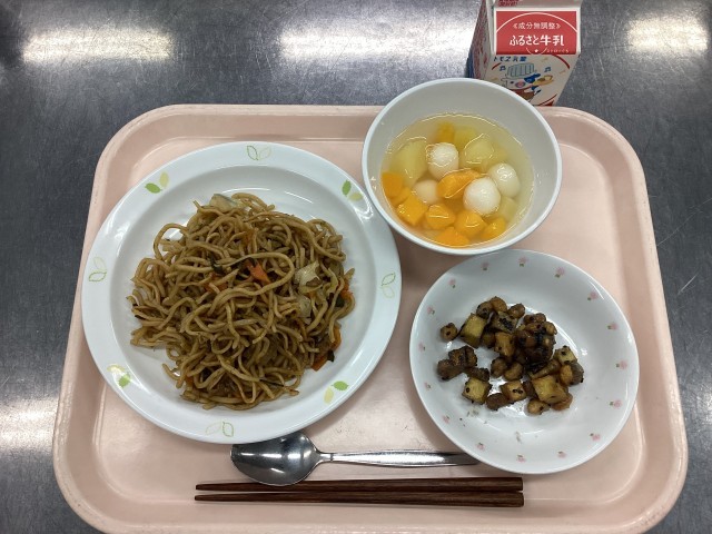 今日の給食は、ソース焼きそば、牛乳、お豆かりんとう、フルーツ白玉です。