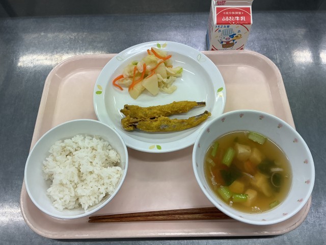 今日の給食は、麦ごはん、牛乳、ししゃものカレー揚げ、和風ポテトサラダ、豆腐汁です。