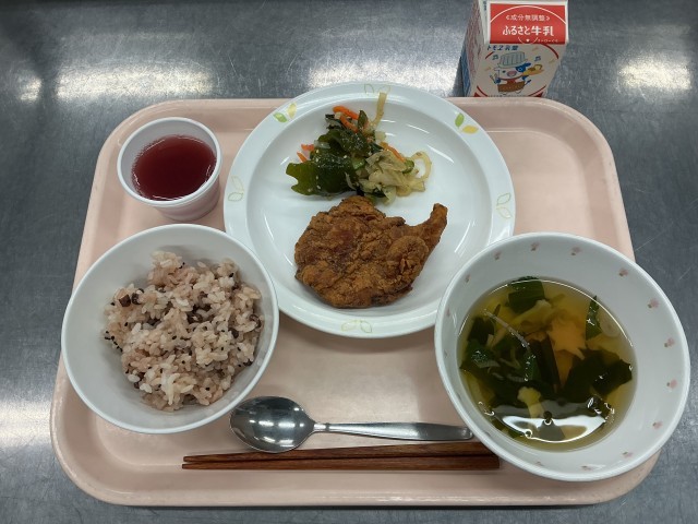 今日の給食は、赤飯、牛乳、鶏肉のから揚げ、わかめサラダ、すまし汁、ぶどうゼリーです。