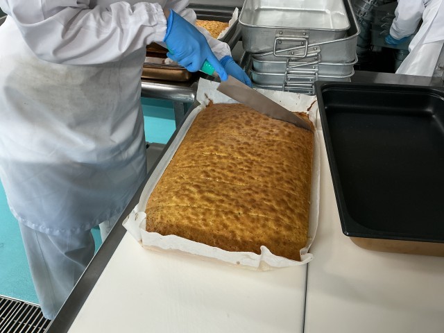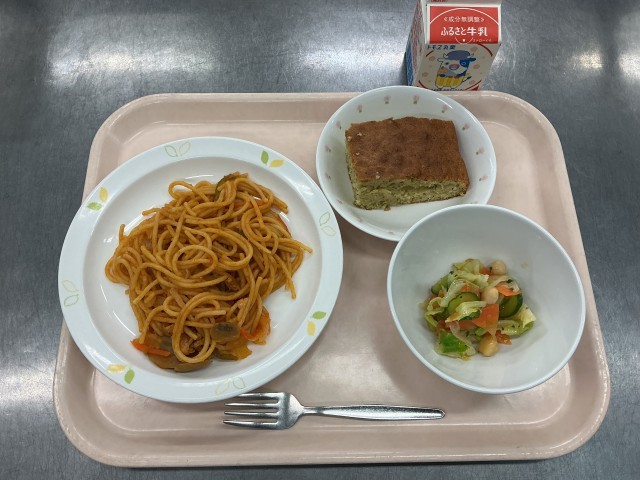 今日の給食は、スパゲティナポリタン、牛乳、イタリアンサラダ、緑茶ケーキです。