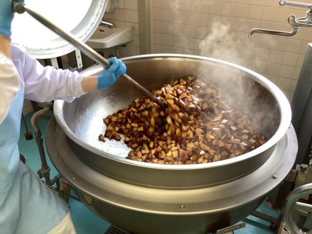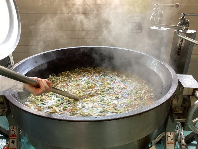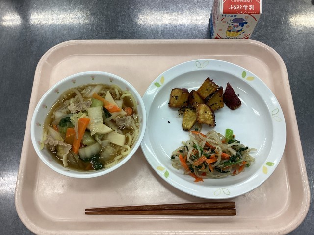 今日の給食は、チャンポン麺、牛乳、大学いも、塩ナムルです。