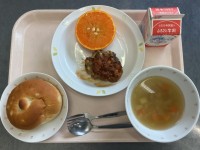 せんべい汁は、青森県八戸市周辺で江戸時代に生まれた伝送的な郷土料理で、みそ汁や鍋に「かやきせんべい」という南部せんべいを入れて煮たものです。初めてのメニューで、せんべいが思ったよりも固く、せんべいを入れるタイミングを給食室のみんなで話し合い、配缶後にせんべいを入れました。
