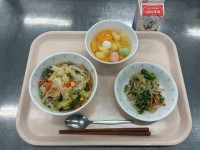今日の給食は、わかめごはん、牛乳、いかとさつまいもの揚げ煮、野菜の甘酢あえ、せんべい汁です。