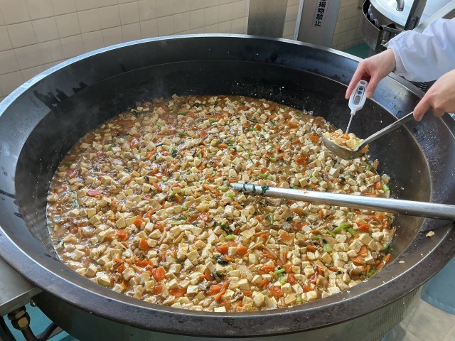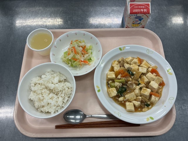 今日の給食は、麦ごはん、牛乳、家常豆腐、中華サラダ、りんごゼリーです。