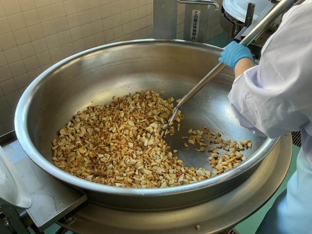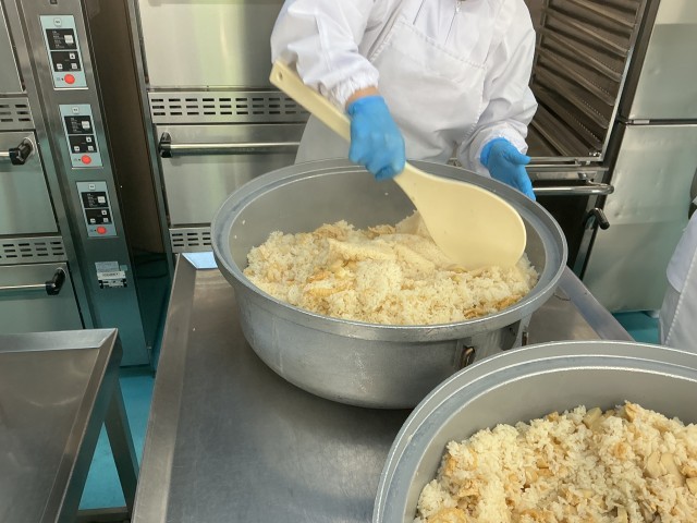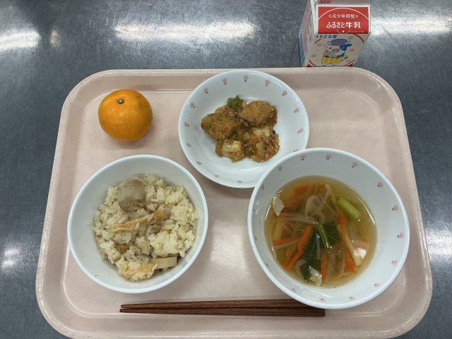 今日の給食は、里芋ごはん、牛乳、生揚げのそぼろあんかけ、沢煮椀、くだもの(みかん)です。