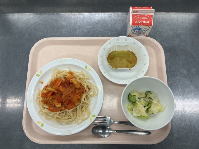 今日の給食は、スパゲティ地中海ソース、牛乳、グリーンサラダ、あしたばのチーズケーキです。