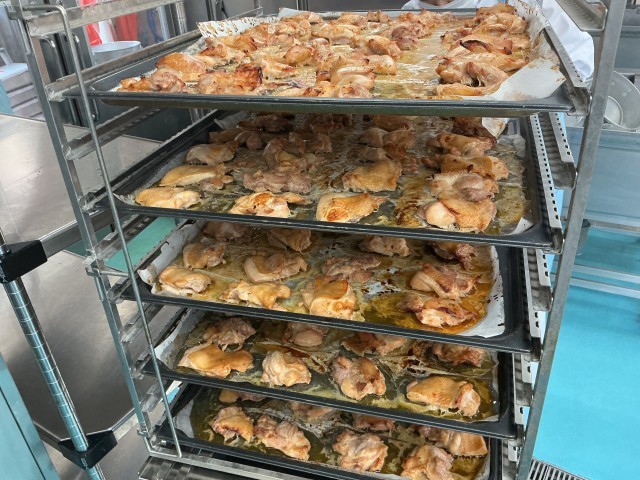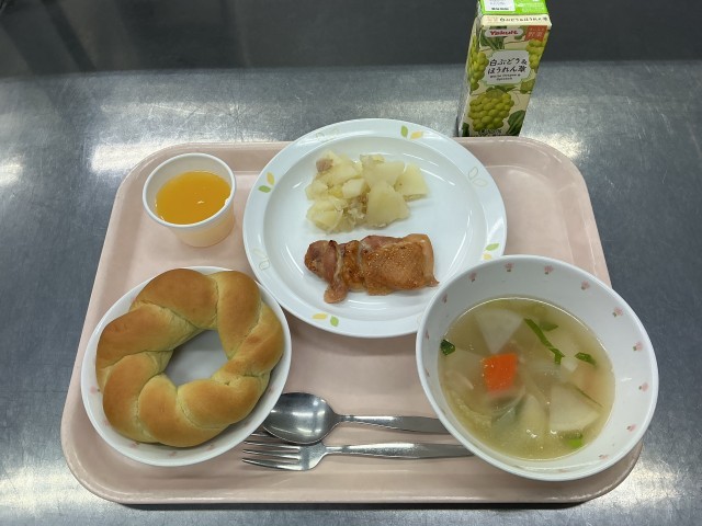 今日の給食は、あしたばパン、野菜ジュース、ローストチキン、ジャーマンポテト、ABCスープ、オレンジゼリーです。