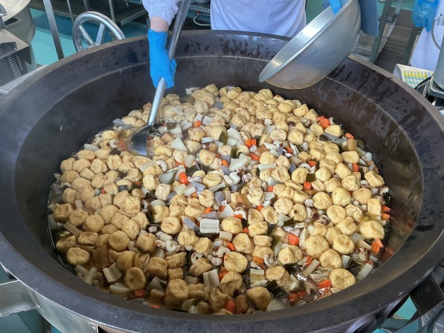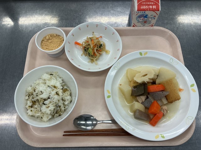 今日の給食は、菜めし、牛乳、おでん、野菜のからしじょうゆがけ、黒蜜寒天です。