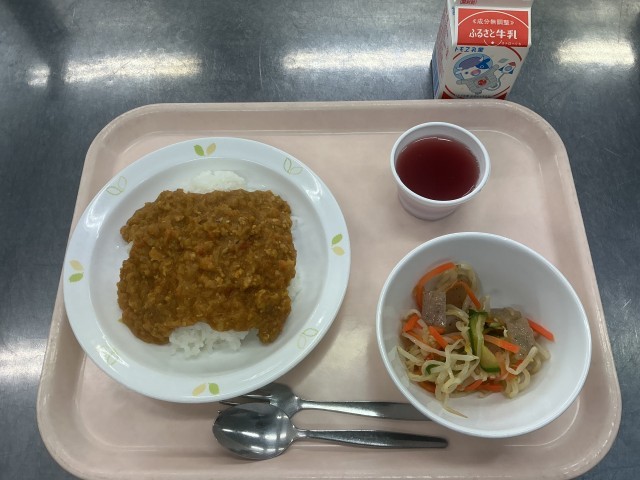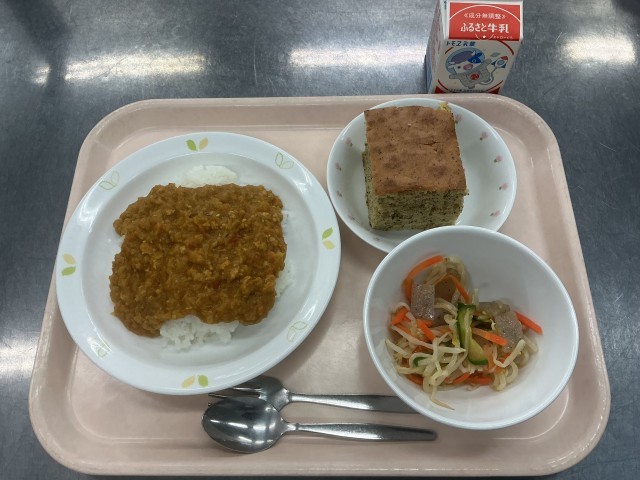 今日の給食は、キーマカレーライス、牛乳、こんにゃくサラダ、セレクトデザート(紅茶ケーキor ぶどうゼリー)です。