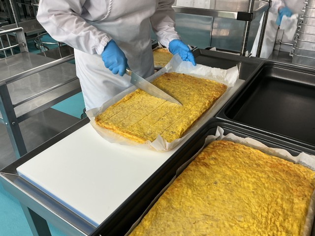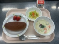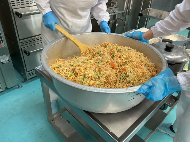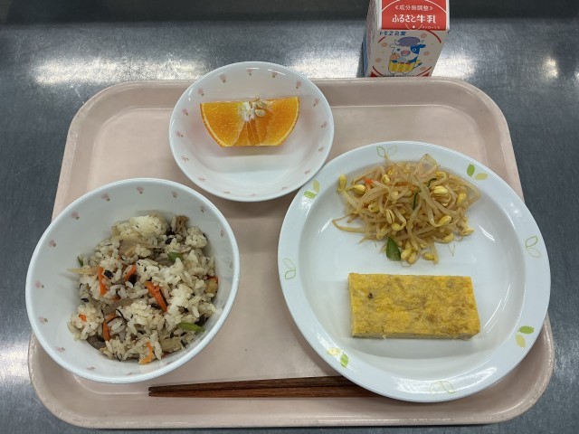 今日の給食は、五目ごはん、牛乳、切干大根の卵焼き、もやしのコチュジャンがけ、くだもの(夢オレンジ)です。