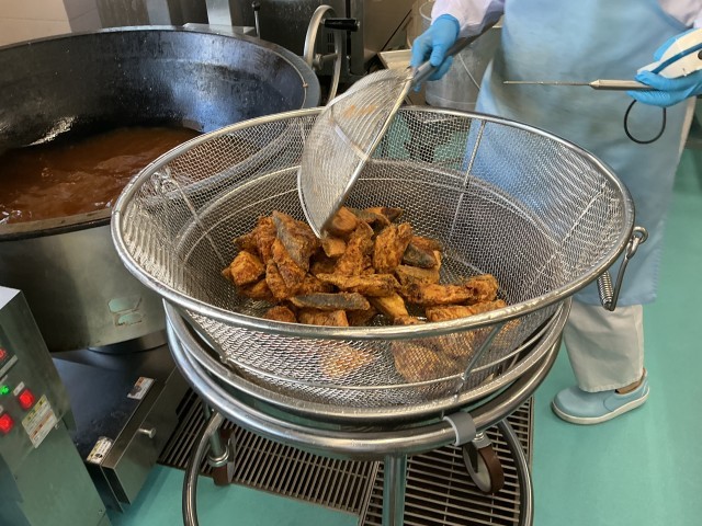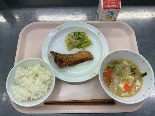 今日の給食は、ごはん、牛乳、魚の立田揚げ、野菜のごま風味、みそ汁です。