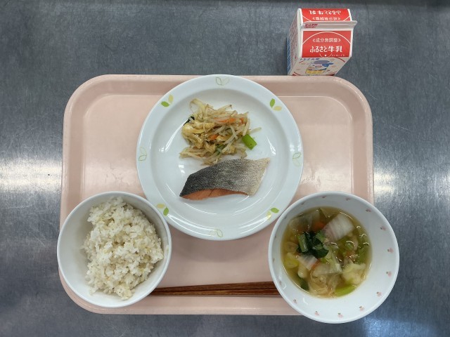 今日の給食は、雑穀ごはん、牛乳、魚の塩焼き、カリカリ油揚げと野菜のひたし、すいとんです。