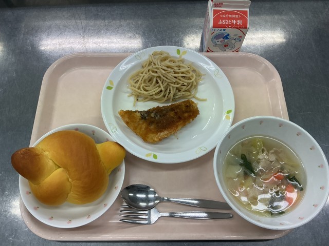 今日の給食は、パンプキンパン、牛乳、魚のバーベキューソース、スパゲティソテー、野菜スープです。
