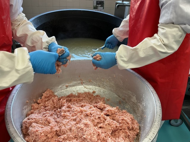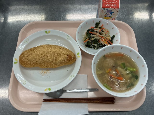 今日の給食は、きな粉揚げパン、牛乳、肉団子入り春雨スープ、和風サラダです。
