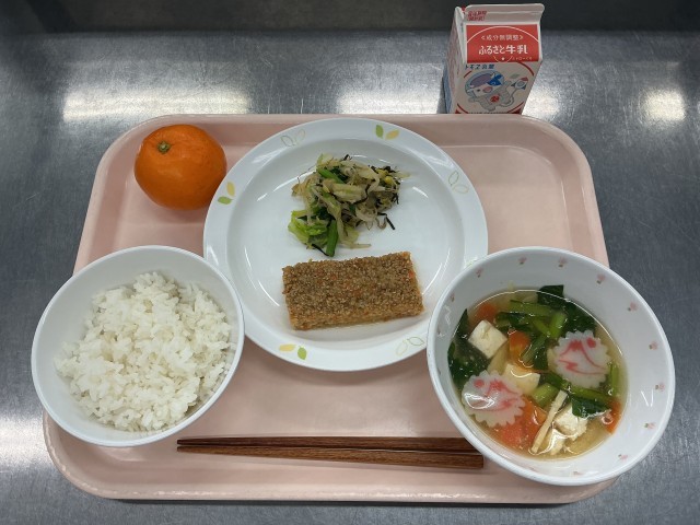 今日の給食は、麦ごはん、牛乳、松風焼き、野菜ののりあえ、吉野汁、くだもの(みかん)です。