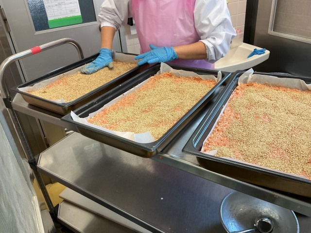 松風焼きは、和菓子の松風ような見た目をした料理で、おせち料理としても使われています。鶏挽き肉をみそや砂糖で味をつけ、平にし、表面にケシの実をかけて焼きます。裏面にはケシの実がついていないことから、裏には何もない、隠し事のない正直な生き方ができるようにという意味があります。お正月は終わってしまいましたが、行事食として松風焼きを取り入れました。