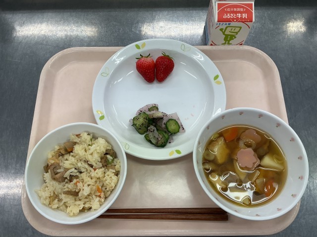 今日の給食は、とりめし、牛乳、ざぶ汁、大根のゆかりがけ、くだもの(いちご)です。