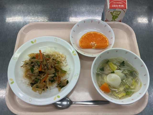 今日の給食は、プルコギ丼、牛乳、トック入りスープ、くだもの(はまさき)です。