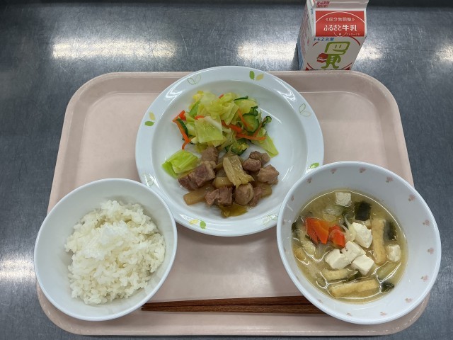 今日の給食は、ごはん、牛乳、豚肉の角煮、即席漬、みそ汁です。