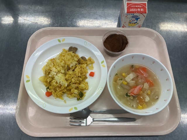 今日の給食は、ツナピラフ、牛乳、トマトとコーンのスープ、ショコラもちです。
