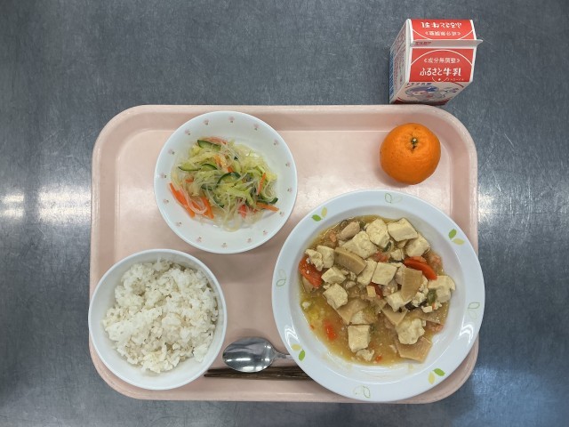 今日の給食は、麦ごはん、牛乳、豆腐の五目炒め、春雨サラダ、くだもの(ぽんかん)です。