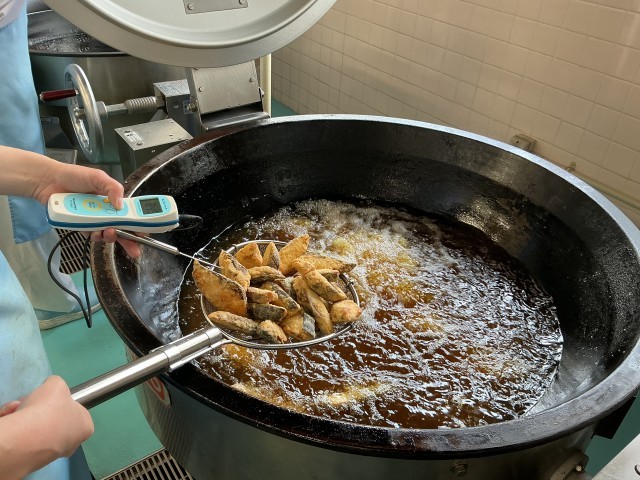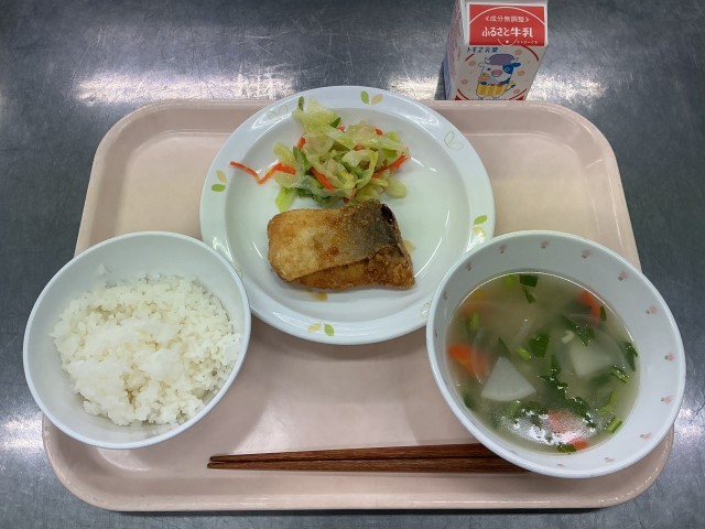 今日の給食は、ごはん、牛乳、魚のレモンソースがけ、アスパラガスのサラダ、ABCスープです。