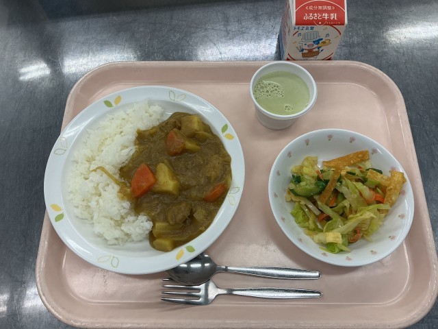今日の給食は、カレーライス、牛乳、パリパリサラダ、あしたばのミルクゼリーです。