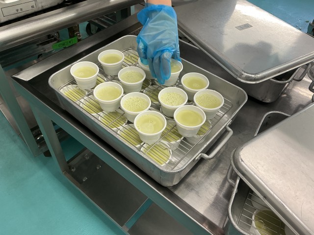 今日は地産地消給食で、あしたばの粉末を使ったミルクゼリーを作りました。