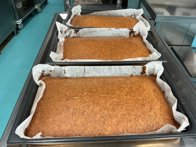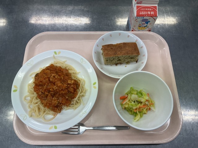 今日の給食は、スパゲティミートソース、牛乳、キャベツサラダ、紅茶ケーキです。