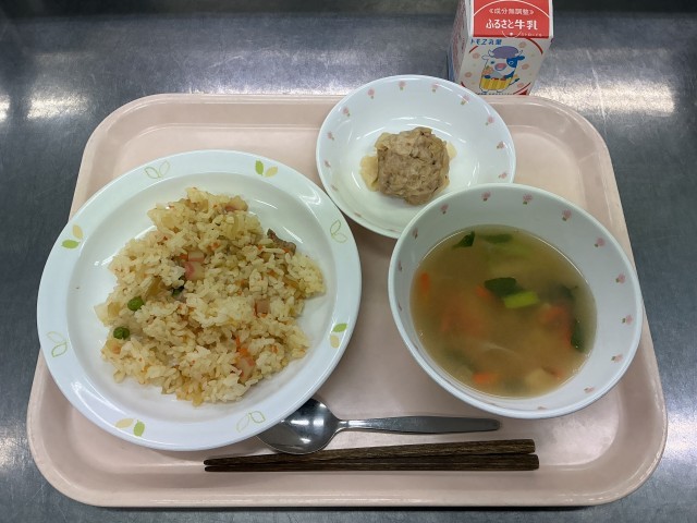 今日の給食は、チャーハン、牛乳、しゅうまい、春雨スープです。