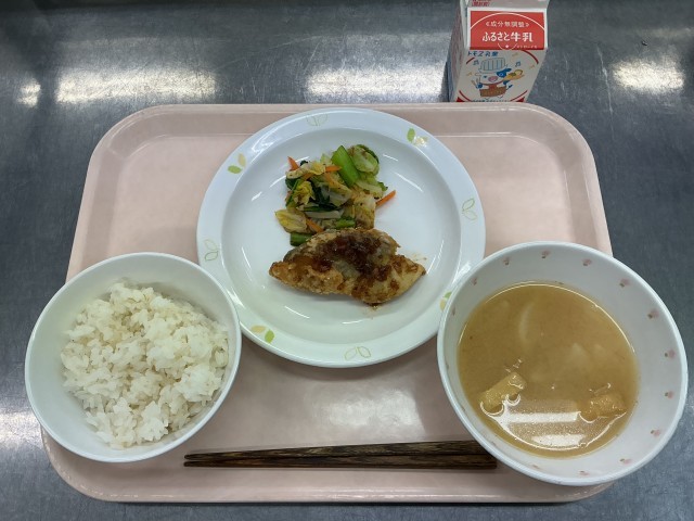 今日の給食は、麦ごはん、牛乳、魚のかわりソースがけ、野菜のおかかがけ、みそ汁です。