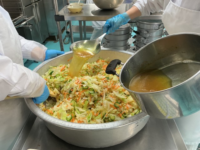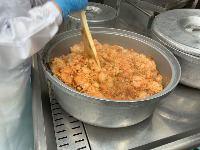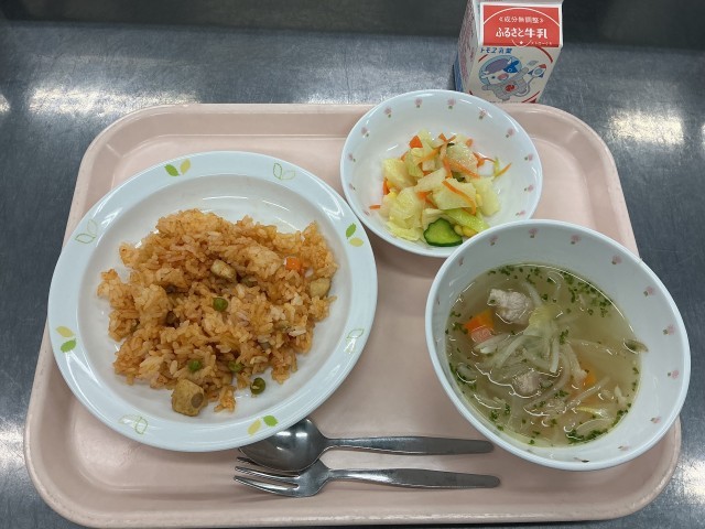 今日の給食は、チキンライス、牛乳、ポテト入りカレーサラダ、野菜スープです。