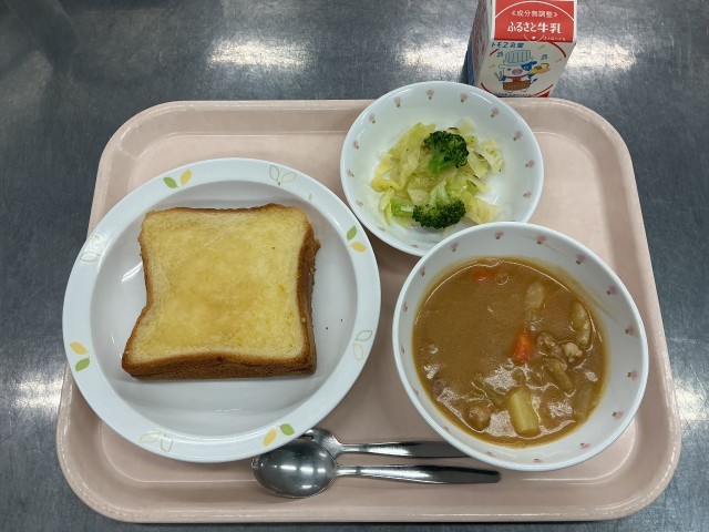 今日の給食は、はちみつレモントースト、牛乳、ポークシチュー、ブロッコリーのサラダです。
