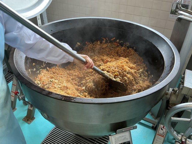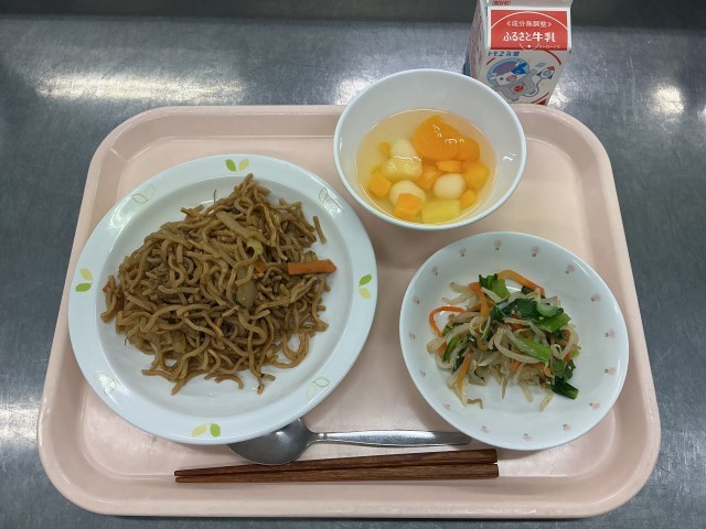 今日の給食は、ソース焼きそば、牛乳、塩ナムル、フルーツ白玉です。