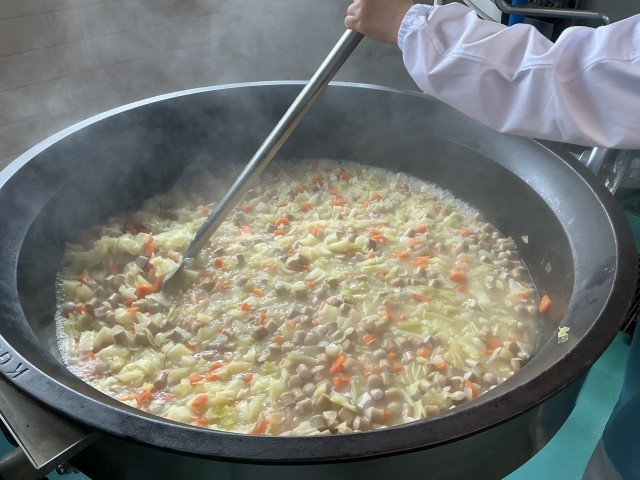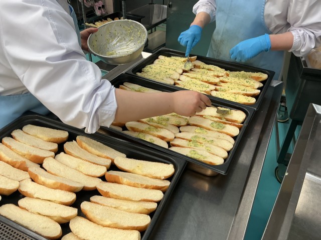 今日は世界の料理給食(フランス)で、フランスパンで作ったガーリックトーストとポトフを取り入れました。