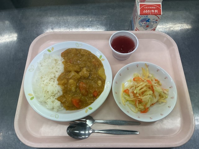今日の給食は、チキンカレーライス、牛乳、じゃがいものハニーサラダ、ぶどうゼリーです。