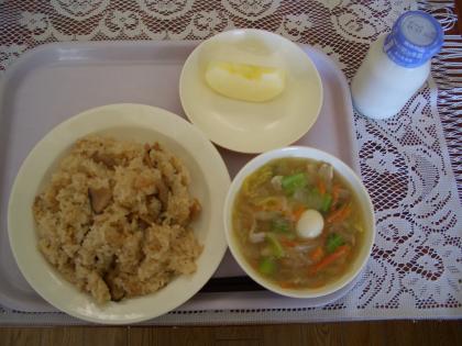 今日のメニューは、中華おこわ、白菜と春雨のスープ、くだもの(りんご)、牛乳です。