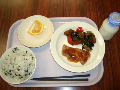 今日のメニューは、わかめごはん、牛乳、魚の梅肉焼き、夏野菜の南蛮かけ、くだものです。