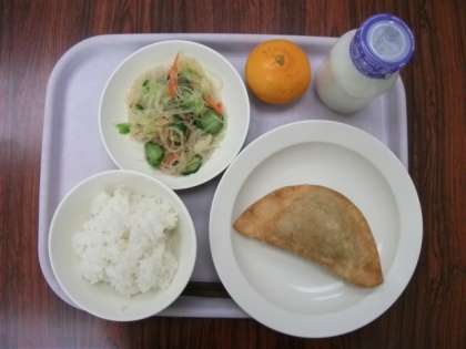 ごはん 牛乳 ジャンボぎょうざ 春雨サラダ くだものです。