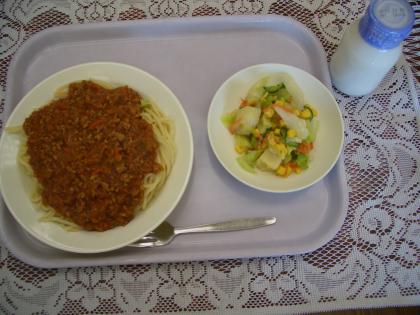 今日のメニューは、スパゲティミートソース、ポテト入りフレンチサラダ、牛乳です。