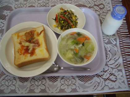 今日のメニューは、ピザトースト、牛乳、ベーコンと野菜のスープ煮、大根とひじきのサラダです。
