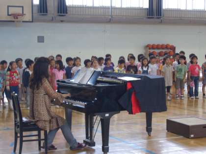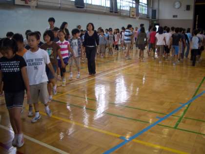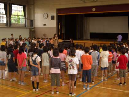 今朝は、“音楽集会”がありました。コの字型の隊形で、「虹」という曲を全校で歌いました。高学年は、上のパートを歌い、二部合唱が上手でした。
